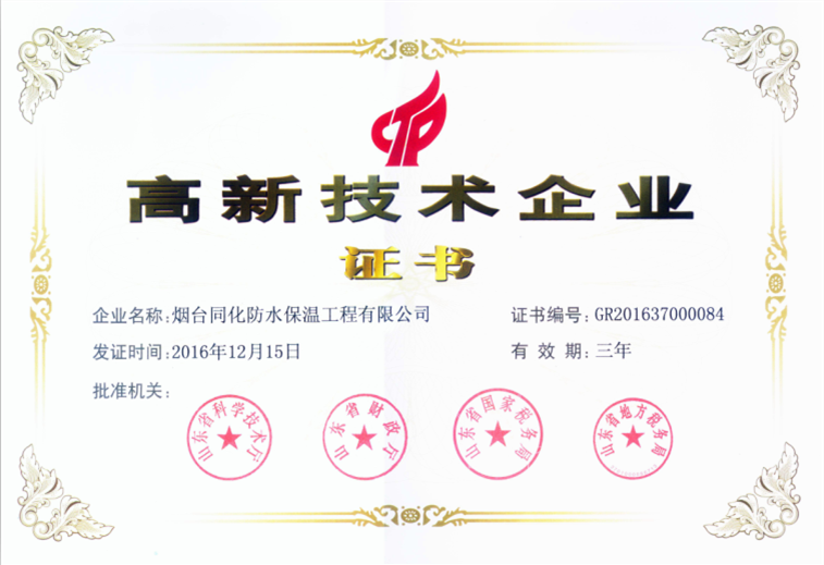 2009年起,煙臺同化防水保溫工程有限公司就通過了國家高新技術(shù)企業(yè)認(rèn)定,2016年底,根據(jù)國家《高新技術(shù)企業(yè)認(rèn)定管理辦法》和《高新技術(shù)企業(yè)認(rèn)定管理工作指引》的相關(guān)規(guī)定,我公司被認(rèn)定為國家高新技術(shù)企業(yè)。國家“高新技術(shù)企業(yè)證書”的再次獲得是對我公司產(chǎn)品技術(shù)所有權(quán)、技術(shù)創(chuàng)新能力、技術(shù)應(yīng)用領(lǐng)域等方面的認(rèn)可。